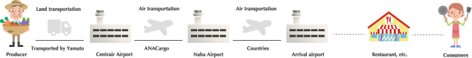 香港への輸送例 生産者/17:00に出荷 → セントレア20:00までに着 → セントレア00:05出発 → 那覇空港02:20到着 → 那覇空港05:10出発 → 香港に06:40着 |